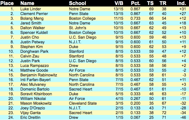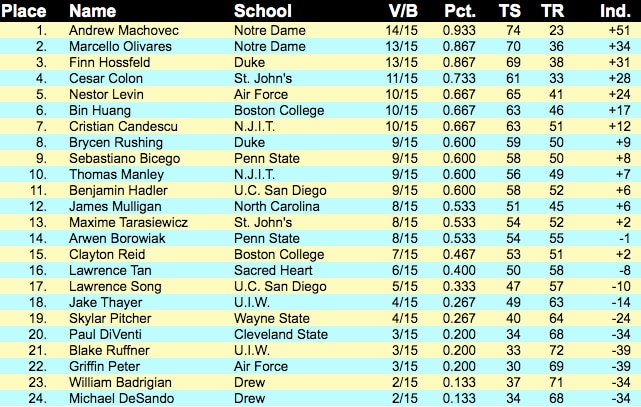 The men's saber results from day one were indicative of the team standings with Notre Dame's Luke Linder, Penn State's Clement Perrier, and Boston College's Bolang Meng placing first, second, and third. In Jared Smith, the Fighting Irish were able to take fourth place as well, contributing to their lead atop the team standings. Below are the complete standings.