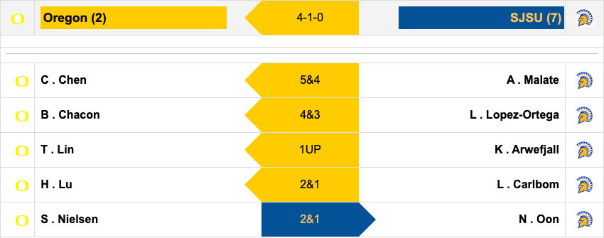 Oregon was the first team to clinch when Hsin-Yu Lu closed out her match over San Jose State's Louisa Carlbom on the 17th hole. Ching-Tzu Chen and Briana Chacon both closed out their matches before reaching the 16th hole. Oregon only dropped one match against the Spartans. Natasha Andrea Oon claimed the one match for her squad in the quarterfinals.