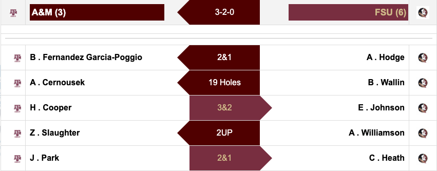 Texas A&M needed extra holes to decide its match against Florida State. After both teams split the first four matches, Adela Cernousek was able to close out Beatrice Wallin on the 19th hole of the match. Cernousek was able to take the match with a two-putt after Wallin went in the bunker and could not get up and down to extend the match.