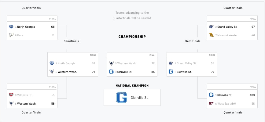 The DII Women’s Elite Eight field took on a new look in 2017. The advancing teams were seeded Nos. 1 through 8. The No. 1 overall seed has won just once since the change, and that was the undefeated 2017 Ashland Eagles.