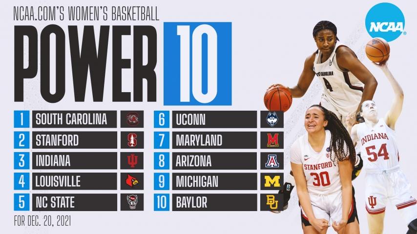Below is the most recent AP Top 25 women's basketball poll, updated on Monday, Dec. 20. South Carolina is No. 1, as it has been all season, while Stanford is up one spot to No. 2.