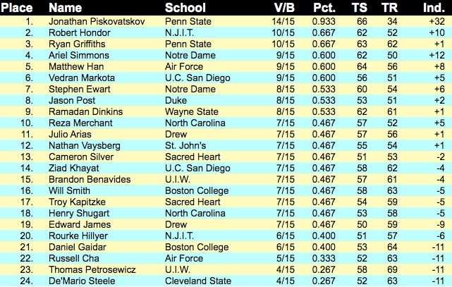 In the men's épée event, Penn State put in a critical result for their standings. Sophomore Jonathan Piskovatskov took first with junior Ryan Griffiths placing third for the Nittany Lions. Below are the complete standings.