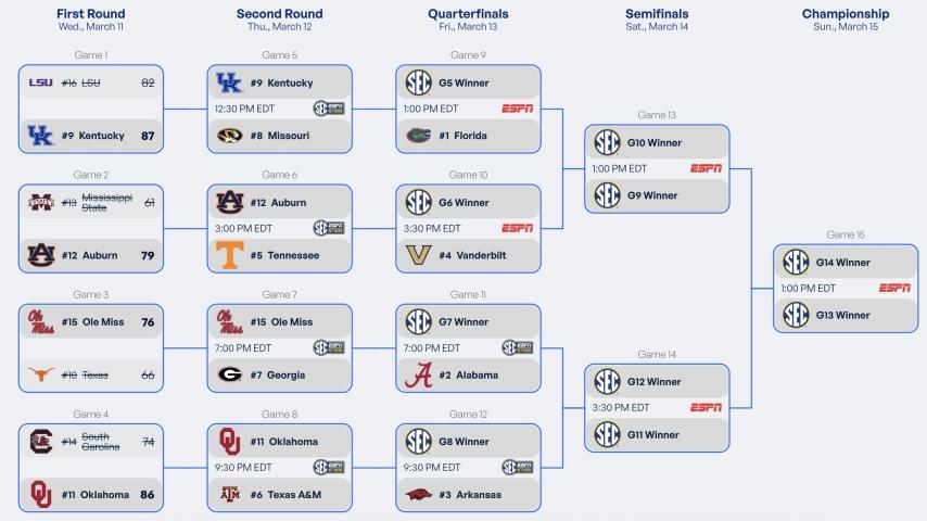 | Play-in: March 2 First Round: March 4 Second Round: March 8 Semifinals: March 9 Championship: 7 p.m. March 10 on ESPN |