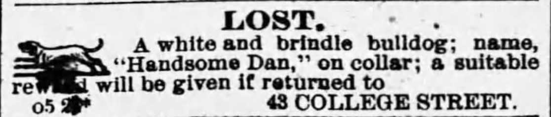 "LOST," read the headline of an ad in the newspaper. "A white and brindle bulldog; name, 'Handsome Dan,' on collard; a suitable reward will be given if returned to 43 College Street."